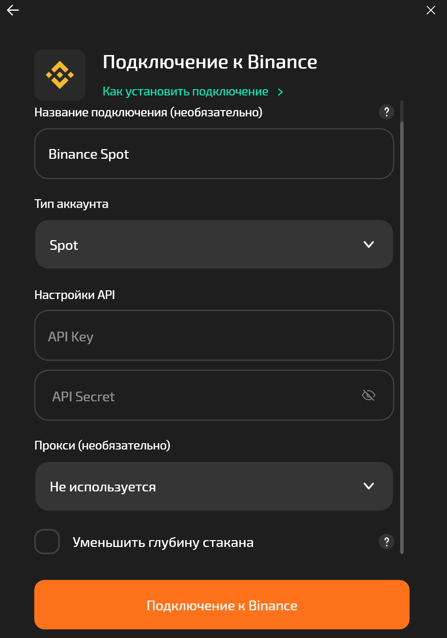 <figure><img src="https://1274720096-files.gitbook.io/~/files/v0/b/gitbook-x-prod.appspot.com/o/spaces%2FhzNfRGfbNL2dtrsyOTEL%2Fuploads%2Fgit-blob-214d2e1e080eb84c926bb8e7efad4f34f9c54c86%2Fimage.png?alt=media" alt="" width="375"><figcaption><p>Окно настройки подключения к бирже Binance</p></figcaption></figure>