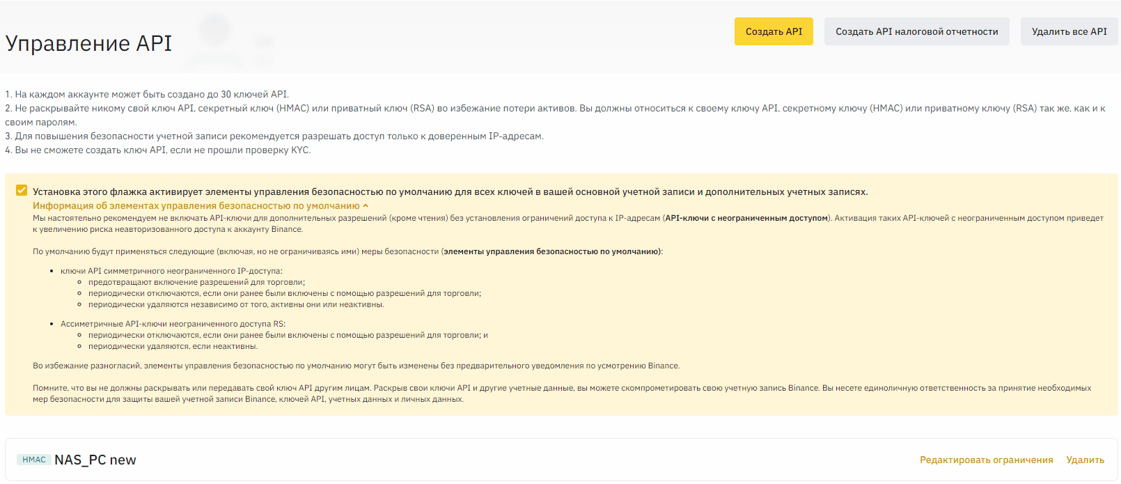 Для соответствия новейшим индустриальным стандартам Binance [обновляет свои API-сервисы](https://www.binance.com/ru/support/announcement/654c092a2a2347bdb5ccd6faa0c6c039). Начиная с 09.08.2021 06:00 (МСК) только пользователи, прошедшие [промежуточную проверку](https://www.binance.com/ru/support/faq/360027287111), могут создавать новые API-ключи. На аккаунтах с базовой проверкой любые существующие API-ключи будут деактивированы после 23.08.2021 03:00 (МСК).