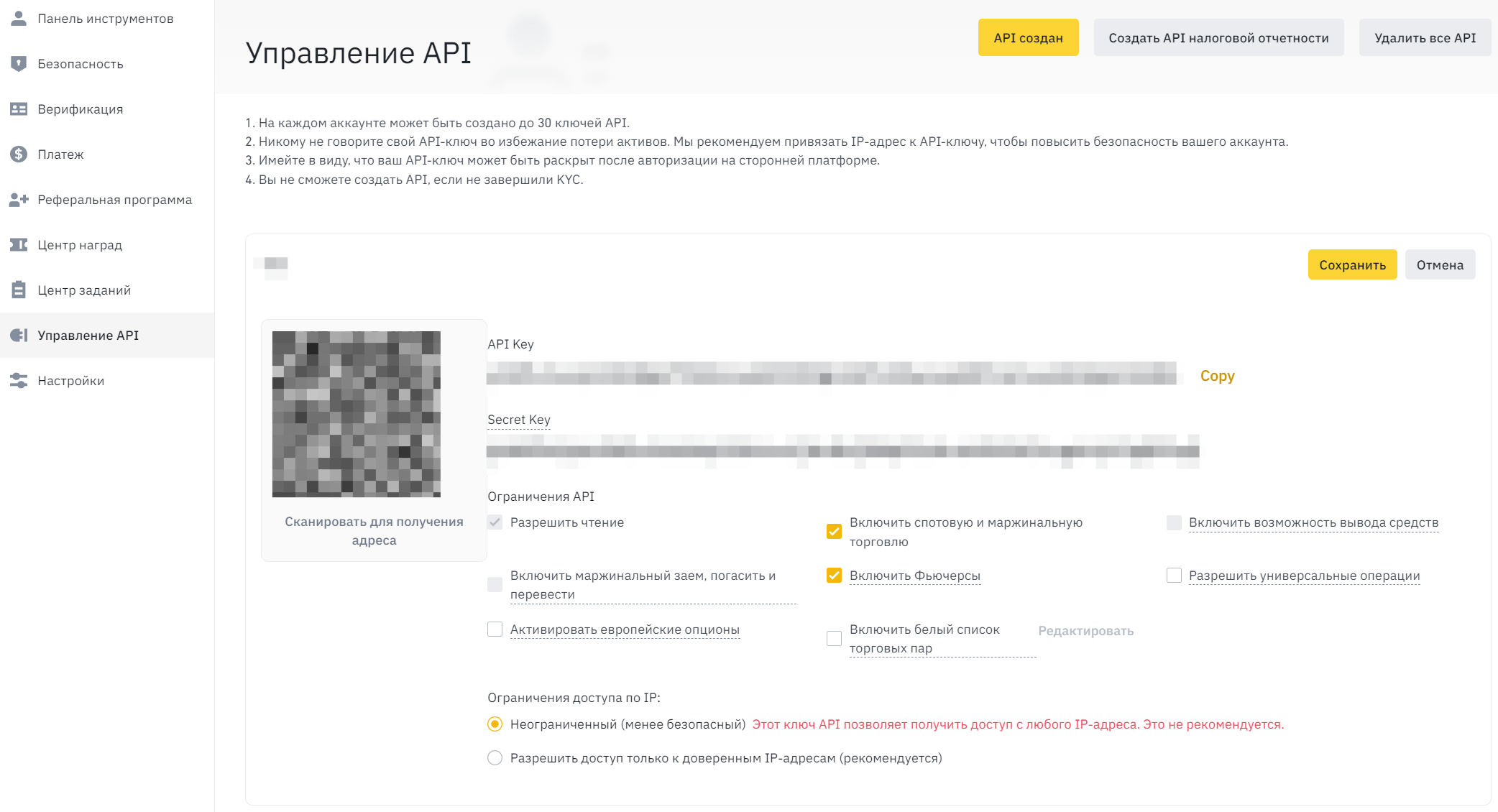 <figure><img src="https://1274720096-files.gitbook.io/~/files/v0/b/gitbook-x-prod.appspot.com/o/spaces%2FhzNfRGfbNL2dtrsyOTEL%2Fuploads%2Fgit-blob-60076bc27ed7b0e9bb31fa58ecc8155f40c8a5e3%2FBinance%20Secutiry%20GIF.gif?alt=media" alt=""><figcaption><p>Создание API ключей на бирже Binance</p></figcaption></figure>