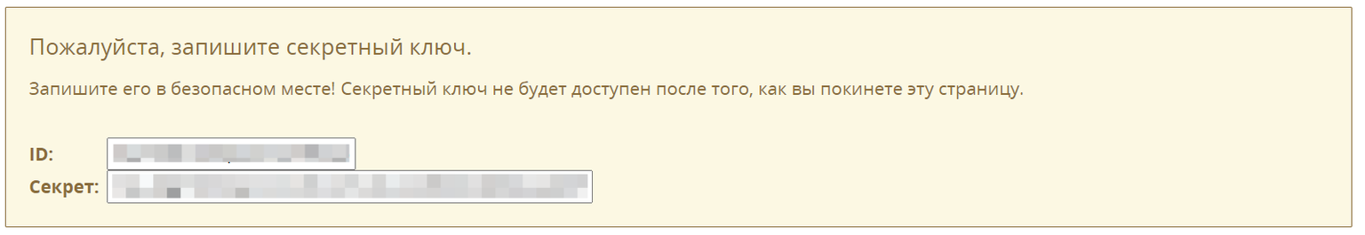 3. После этого на этой же странице отобразятся созданные ключи. Сохраните эти ключи, так как больше не будет возможности просмотреть их.\\