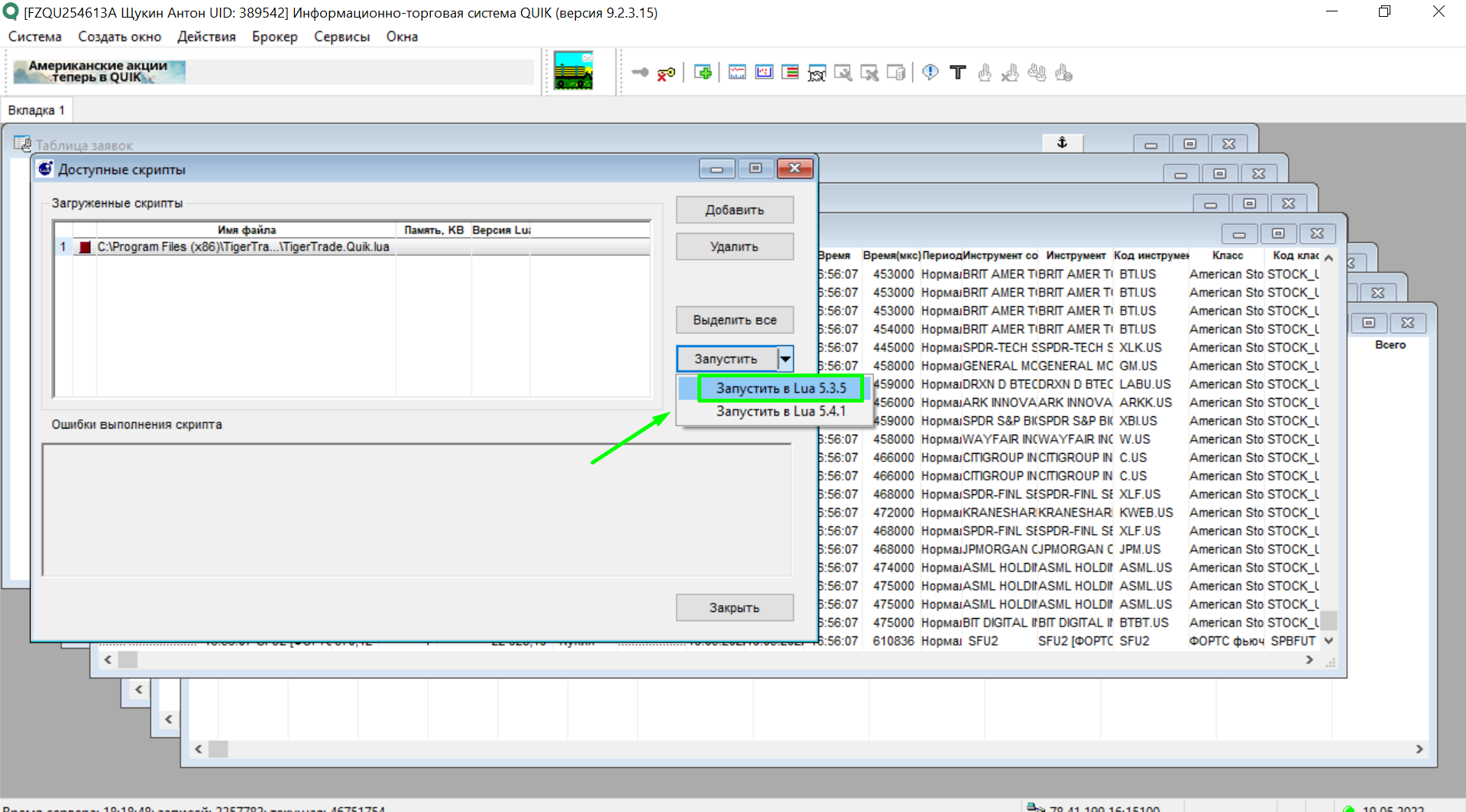 7. В главном меню QUIK выберите **Сервисы → Lua скрипты**. В открывшемся окне нажмите **Добавить** и выберите файл **С:\ProgramFiles(x86)\TigerTrade\Connectors\Quik\TigerTrade.Quik.lua**.\