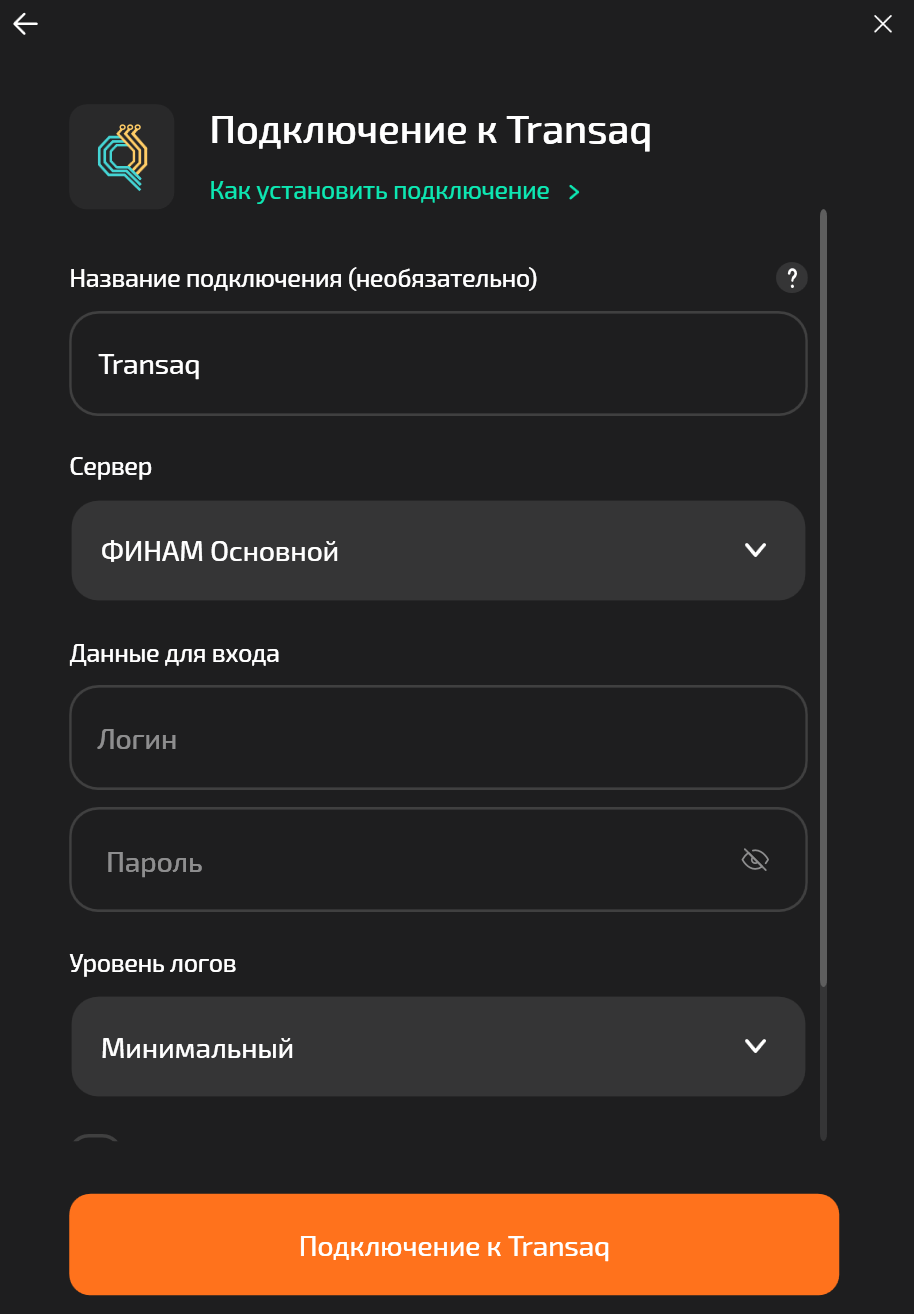 Перед настройкой убедитесь, что брокер подключил вам торговлю через [**Transaq Connector**](https://www.finam.ru/howtotrade/soft/tconnector/) и предоставил логин с паролем. Логин и пароль от терминала [**Transaq**](https://www.finam.ru/howtotrade/soft/transaq/) использовать нельзя.