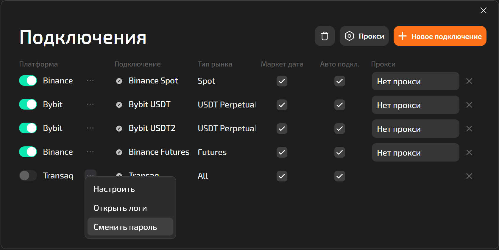 2. В открывшемся окне нажмите кнопку <mark style="color:orange;">`+Новое подключение`</mark> и в появившемся списке выберите Transaq.