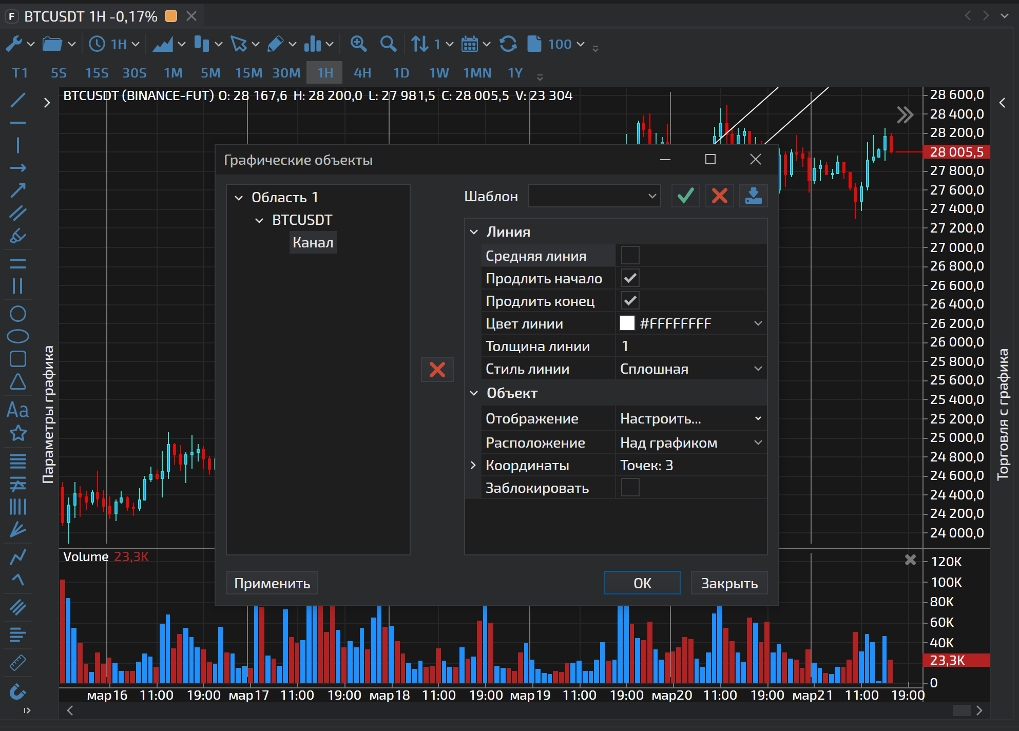 | Координаты    | Имеется возможность установить точные координаты расположения линии в области графика по оси времени и по оси цены.          |