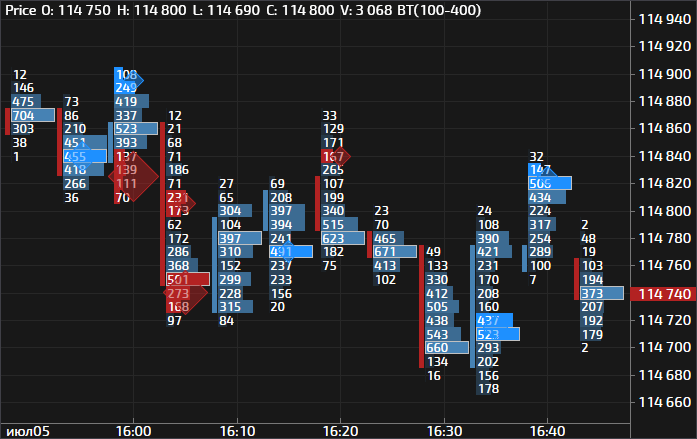 Отображает на графике крупные одиночные сделки, проходящие по ленте.