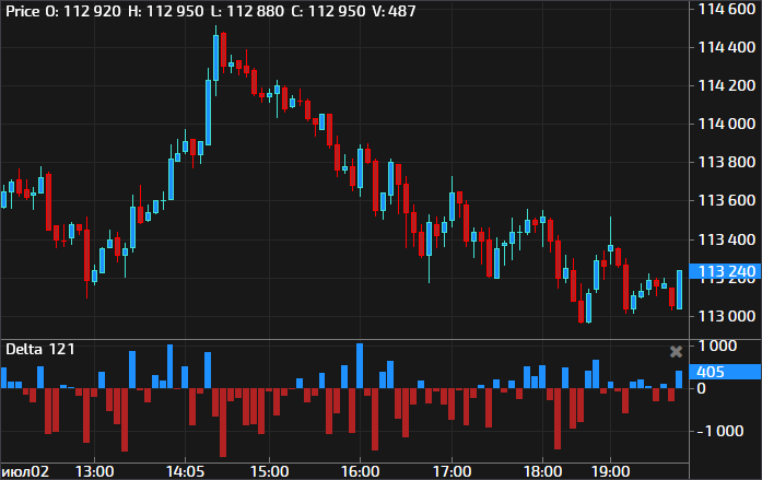 Delta = Ask (объём рыночных покупок) − Bid (объём рыночных продаж)