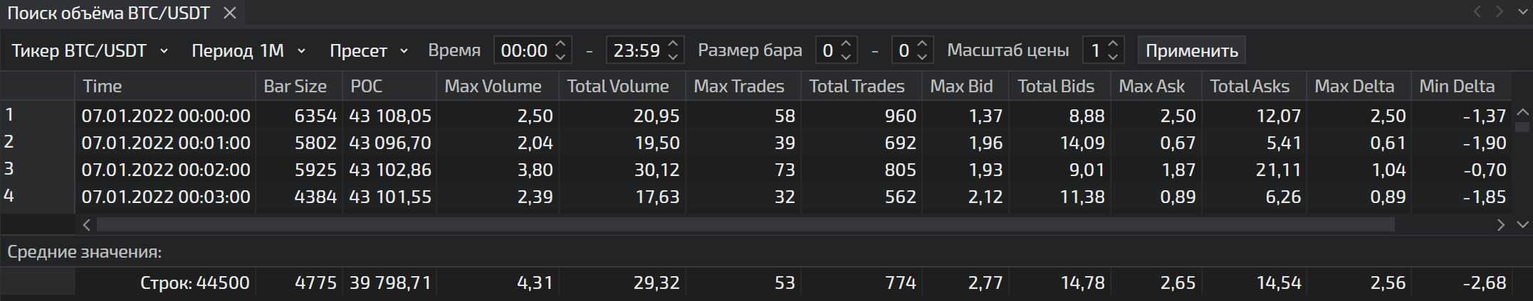 В таблице есть информация как о суммарном значении объёма для всего бара, так и о ячейке с максимальным объёмом. Поиск объёма является незаменимым инструментом для настройки фильтров.