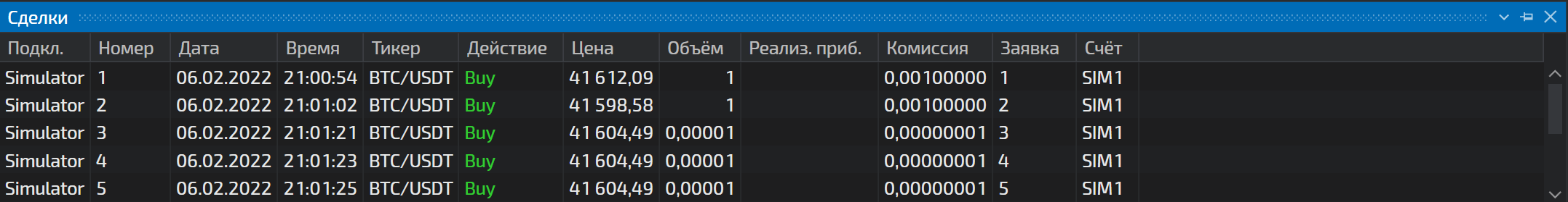 | Подкл.        | Подключение, через которое была совершена сделка.                                          |