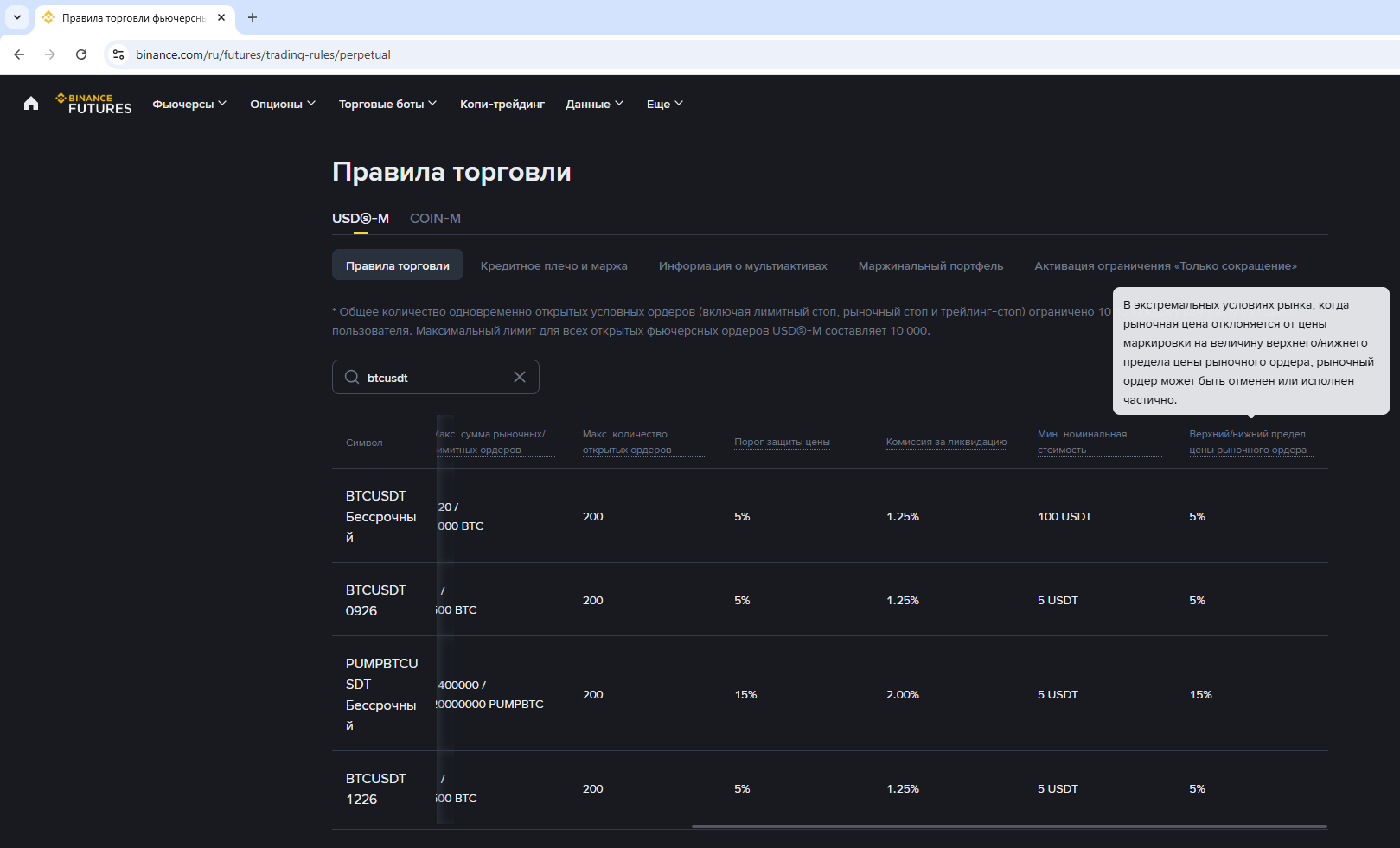 В [правилах торговли биржи Binance](https://www.binance.com/ru/futures/trading-rules/perpetual) для каждого из инструментов установлен предел цены рыночного ордера:&#x20;